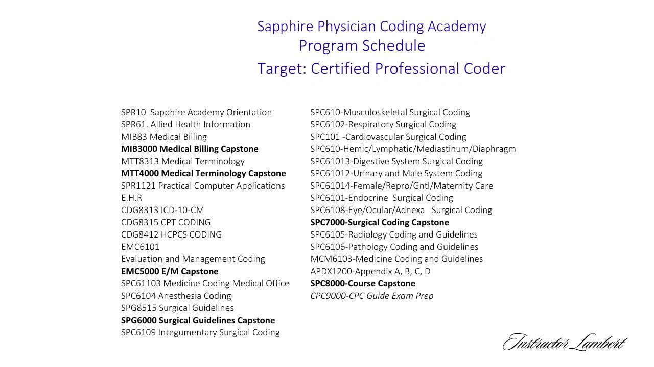 Download immediately start learning now! This is a course that cost thousands at a traditional college. Sapphire Academy gives you all the tools you need to learn this trade. Create your own Billing or Coding Business stick with us use our tools, check out our classes. You get a Sapphire Portal email for access to the Sapphire Academy. Join us.